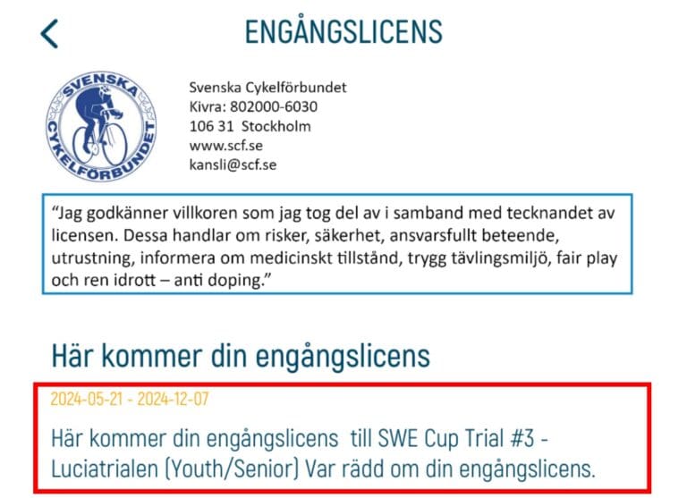 Genom vårt sammarbete med Svenska Cykelförbundet så gäller deras licenser som försäkring på våra event.
