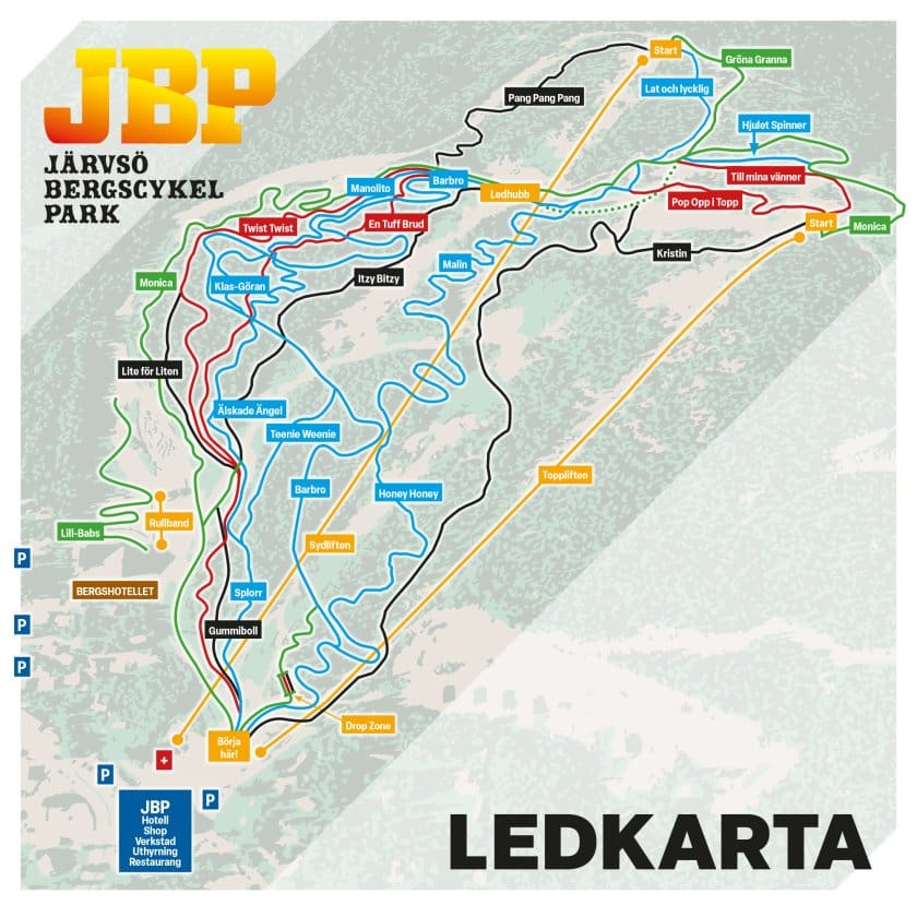 JBP har allt från de enklaste gröna till de riktigt tuffa lederna för experterna. Underlaget i lederna varierar från finaste jord till rötter och sten. Det finns också byggda broar, hopp, klippor och andra features som gör cyklingen roligare.
